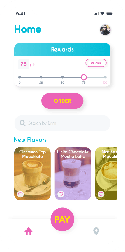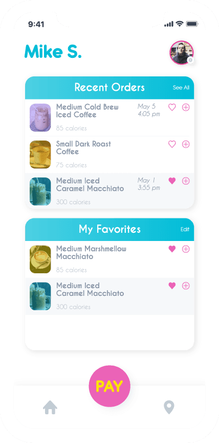 My main goal as the UI/UX Designer was to craft an app for coffee lovers that made things easier on them and had a fun, playful feel. Tasks such as finding new drinks, ordering, and reloading were the big pain points..