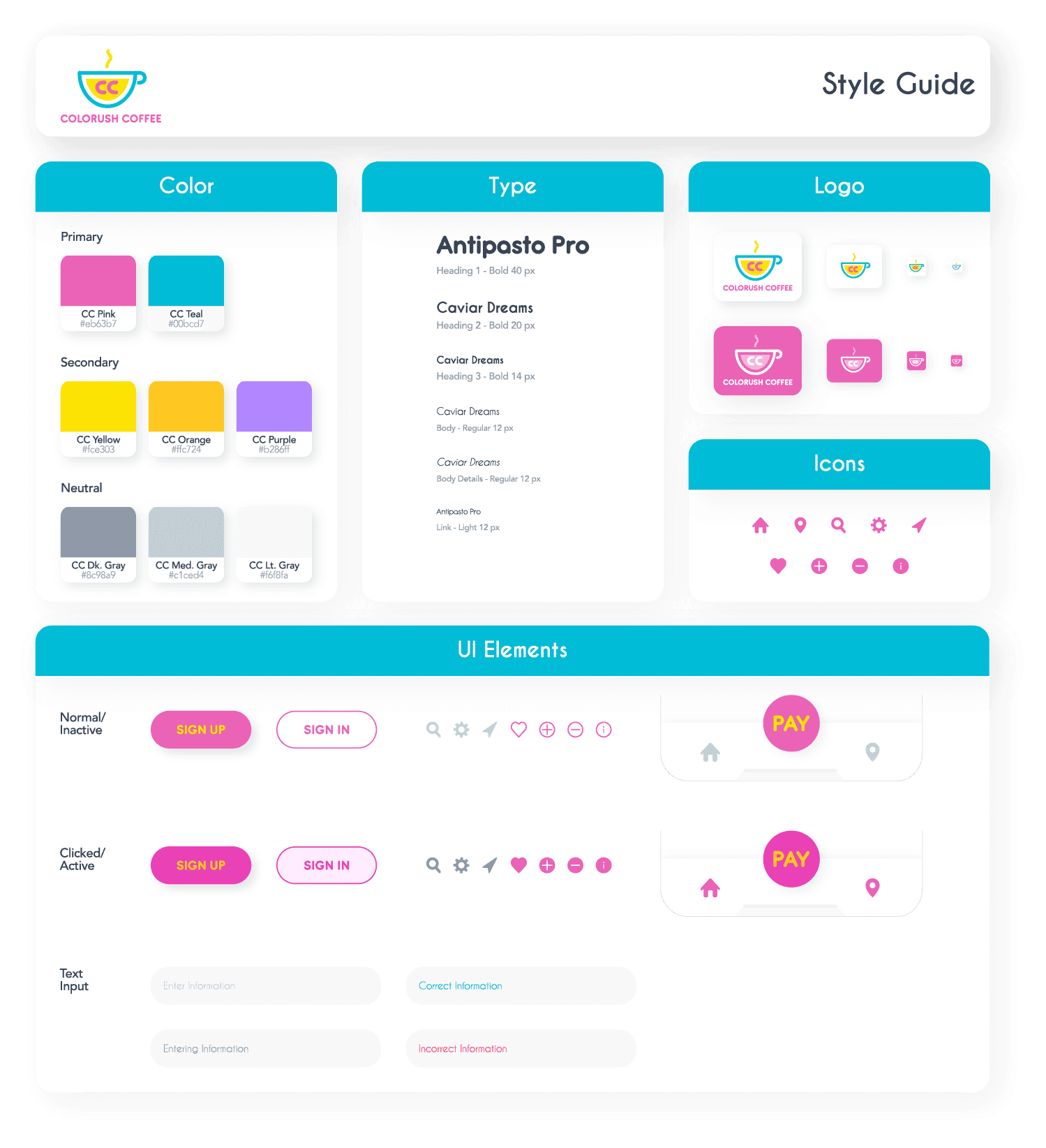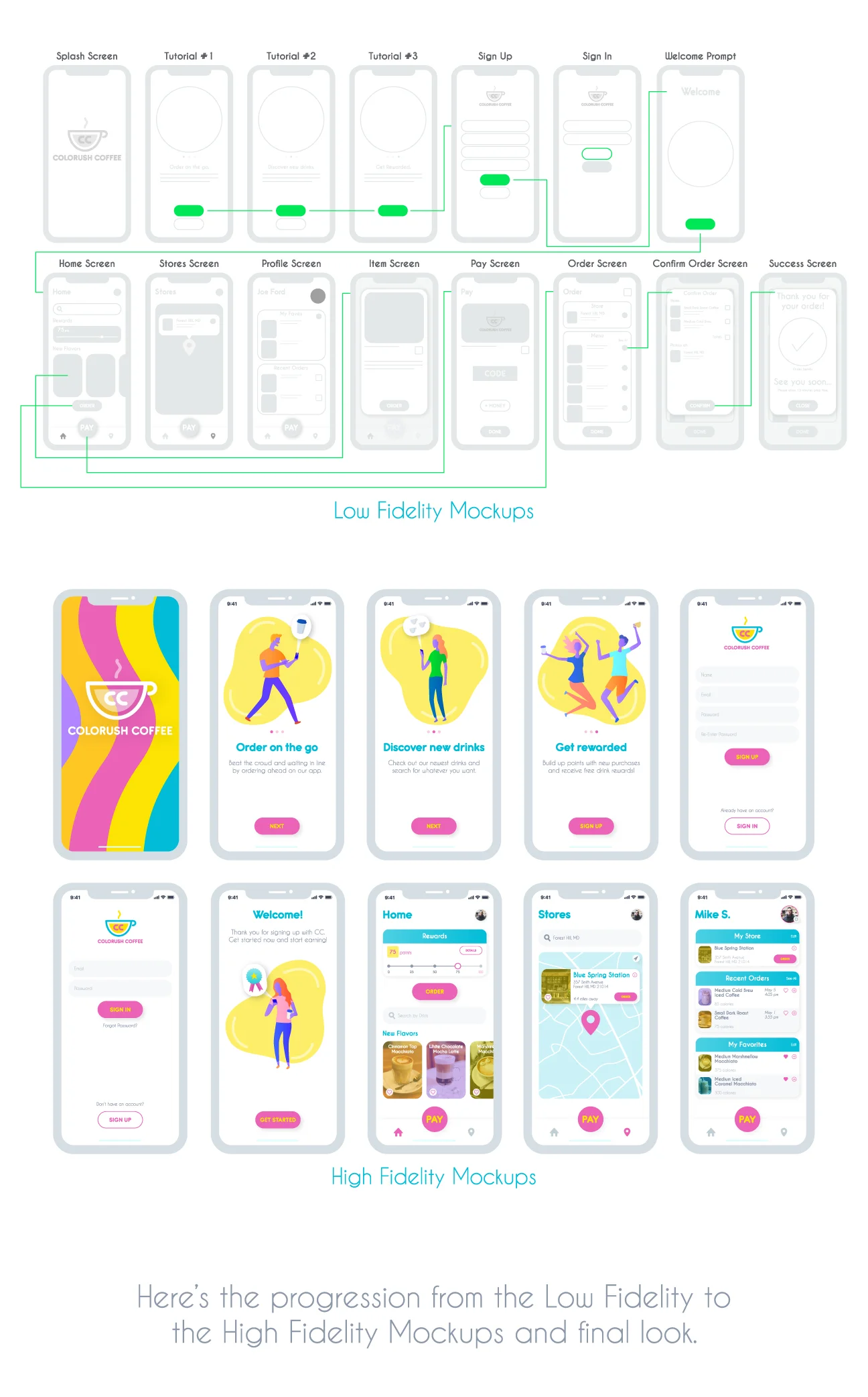 Colorush Coffee is a mobile app where users can order and find new coffees. Stemming from issues with other coffee apps, this is a solution to fixing user flows and making tasks as easy as possible.